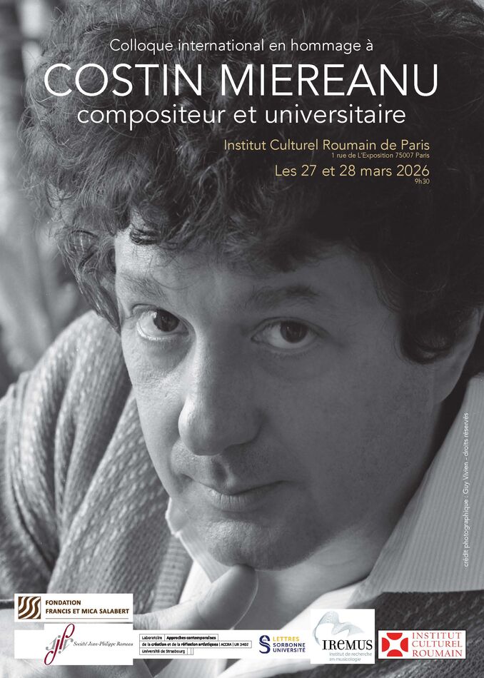 Ce colloque international est organisé en hommage à Costin Miereanu à l’occasion de sa récente disparition. Né le 27 février 1943 à Bucarest, établi à Paris en 1968 et naturalisé français en 1977, Costin Miereanu a composé l'essentiel de son œuvre en France. A l'occasion de ses soixante-dix ans, ce colloque veut rendre hommage à un musicien à la poésie complexe, qui fut également directeur artistique et musical des éditions Salabert, co-directeur artistique de l'ensemble 2e2m et professeur à l'Université de Paris-1–Panthéon-Sorbonne jusqu'en 2013, et qui a obtenu les Prix de la Fondation Européenne pour la Culture (Hollande,1967), Prix de composition Georges Enesco (SACEM, 1974), Prix de la Partition pédagogique (SACEM,1992), Grand prix de l'UCMR (Union des compositeurs et musicologues roumains, 2010). Il fut docteur en sémiotique musicale (EHESS, 1978), docteur d'Etat ès Lettres et Sciences humaines (université Paris 8, 1979), officier du Grand Ordre du mérite culturel roumain (2008), Doctor Honoris causa de l'université des Arts de Iassy (2010) et de l'Académie supérieure de musique de Cluj-Napoca, Roumanie (2012), professeur émérite à l'université de Paris-1 et vice-président de la Fondation Francis et Mica Salabert dont il a été co-fondateur (1981) avec Iannis Xenakis et Marcel Landowski.